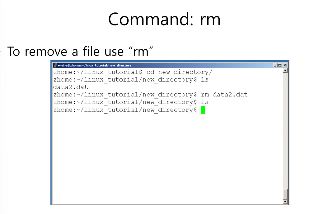 rm 파일명 : 파일을 삭제하는 명령어 (rm 지우고자 하는 파일명)