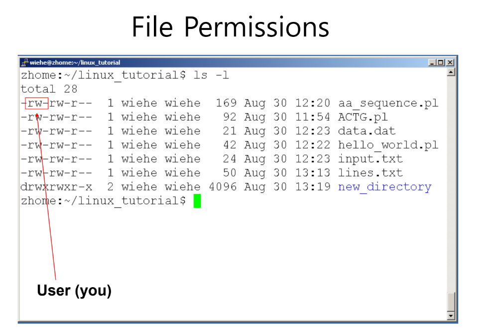 user(사용자) group(사용자가 속한 그룹) others (2가지 사용자를 제외한 나머지 모든 사용자 순서대로 권한 표시)