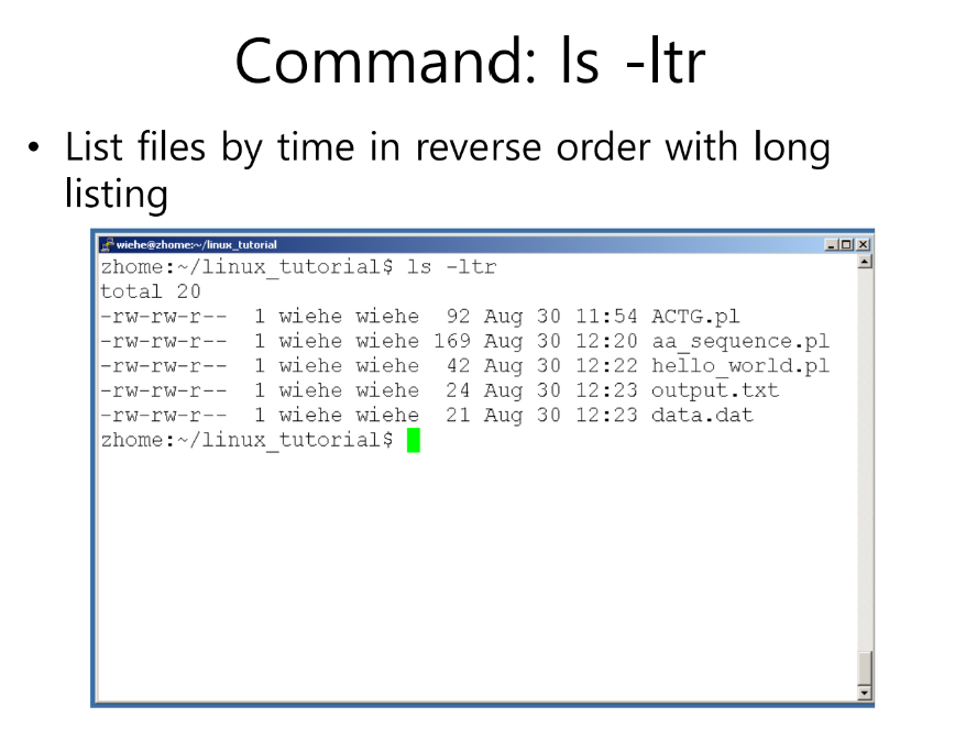 - -l: 긴 목록(많은 정보를 표시) ex) 파일 이름 뿐만이 아닌 파일의 크기, 권한 등등 다양한 정보를 알 수 있음 [가장 많이 사용됨!]