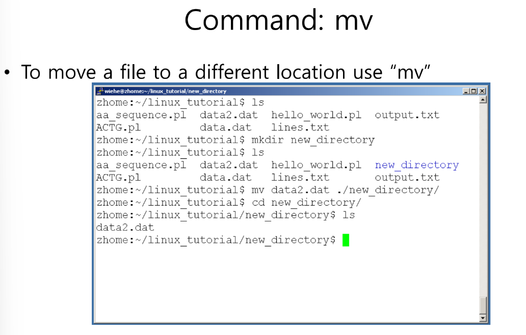 - mv : 파일을 이동하거나 이름을 재할당 ex) mv temp.txt / (temp.txt 파일을 루트 디렉터리로 이동)