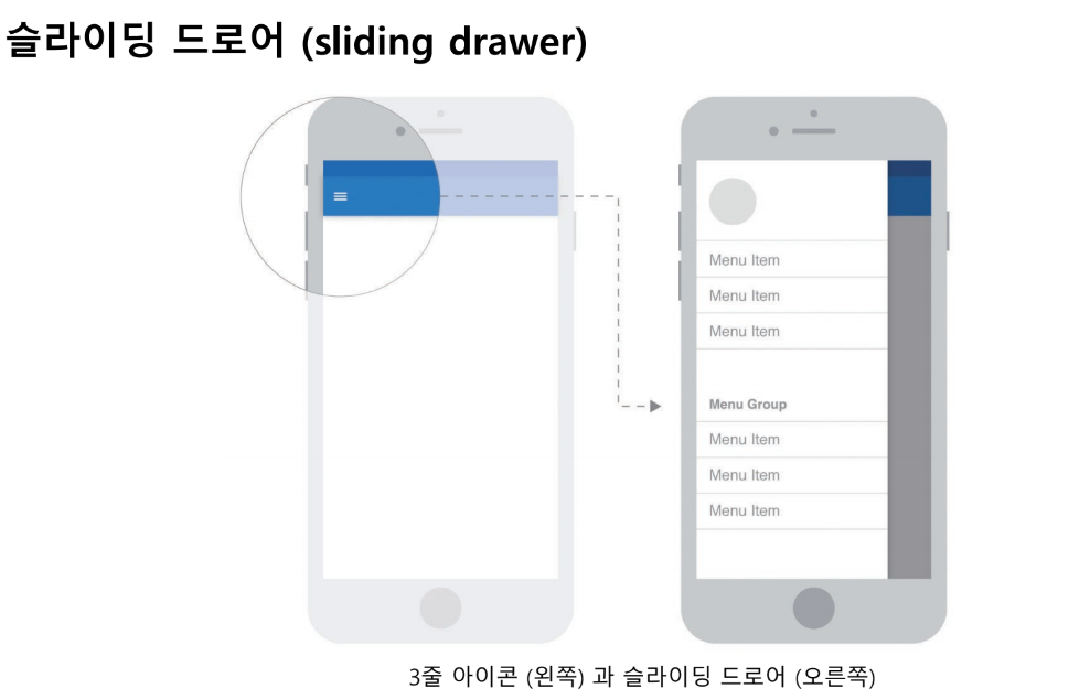 슬라이딩 드로어는 다수의 섹션이 동일한 중요도를 가진 앱이나 특정 섹션에서만 주로 시간을 보내는 앱의 경우 좋은 솔루션이 될 수 있음