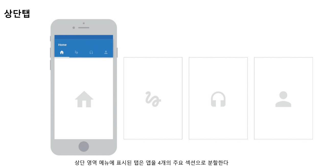 하단 메뉴는 사용자의 엄지 손가락과 가깝기 때문에 큰 수고를 들이지 않고도 섹션을 쉽게 변경 가능 / 최대 5개의 섹션으로 앱 콘텐츠를 분할하도록 디자인 됨