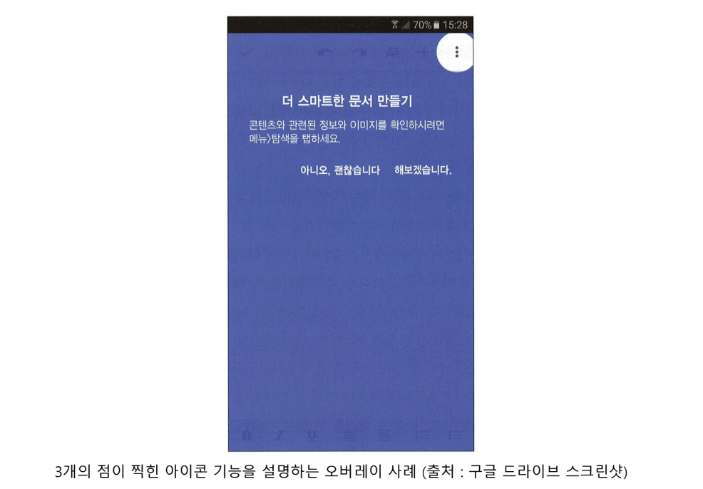 오버레이 팁을 사용하여 최근에 앱에 추가된 신기능을 설명하거나 사용자가 써본 적 없는 기능을 강조할 수 있음, 지속적으로 개선된 앱은 살아 있는 앱이지만, 변경은 사용자가 기능을 찾지 못할 확률을 줄여나가면서 신중하게 진행해야 한다.