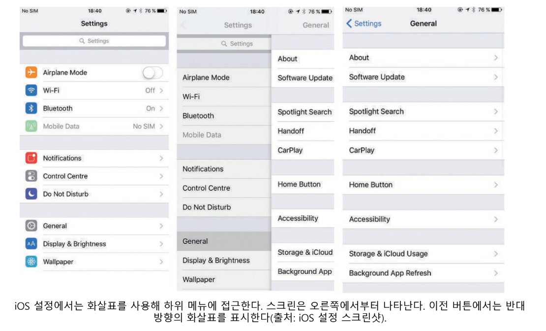 일반적으로 위아래 화살표는 콘텐츠를 스크롤하거나 표시할 때 사용되고, 좌우 화살표는 스크린 사이에 앞뒤로 움직이는 것을 보여줄 때 주로 사용됨 (ios에서는 메뉴 옵션에서 화살표를 주로 사용함)