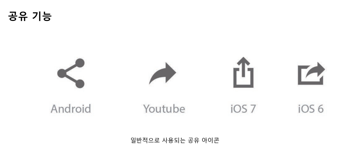 안드로이드에서는 연결된 3개의 점이 가장 일반적인 아이콘인 반면, ios 사용자는 위로 향하는 화살표가 있는 박스 형태에 익숙함