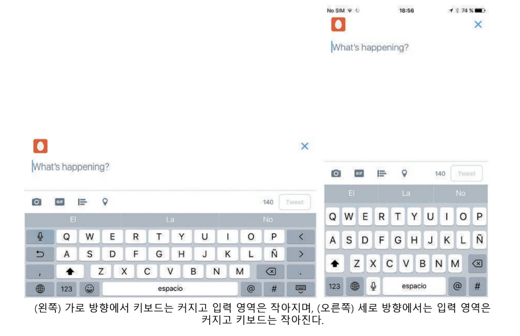앱에서는 이 같은 방향을 이용하여 앱 콘텐츠를 보는 새로운 방식 or 양손으로 사용할 수 있는 새로운 인터렉션 방법을 소개할 수 있음 ex) 비디오 앱에서는 가로보기 모드를 제공하여 비디오를 전체 화면과 컨트롤 버튼으로 보여준다.