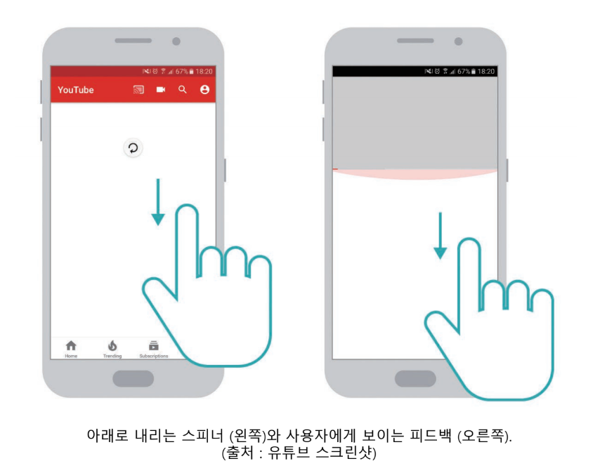 사용자 제스처에 시각적 피드백을 추가하려면 일종의 스피너를 포함시켜 스크린 상단이 늘어나는 동안에 사용자의 손가락 움직임을 따르게 함 / 일부 앱에서는 사용자가 아래로 내릴 때 길어지는 그림자를 추가하여 동일 효과를 내기 위해 화면 상단을 늘림