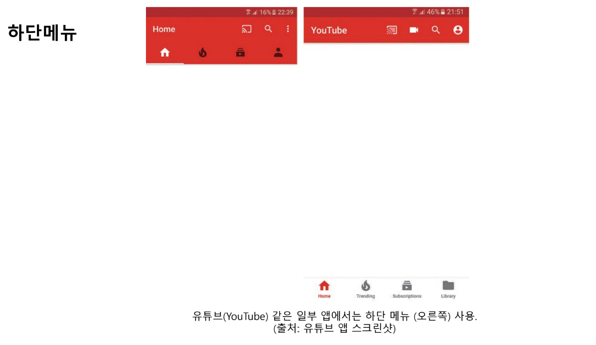 - ios는 스크린 하단에 앱 메뉴를 제공하는 방법이 특징 / 안드로이드는 메뉴를 하단과 상단 양쪽 모두에 탭 or 드로어 형태를 제공, 최근 트렌드에서는 다수의 앱이 안드로이드에서 하단 메뉴를 포함, 구글도 머티리얼 디자인 가이드라인에서 이러한 트렌드를 고려해옴