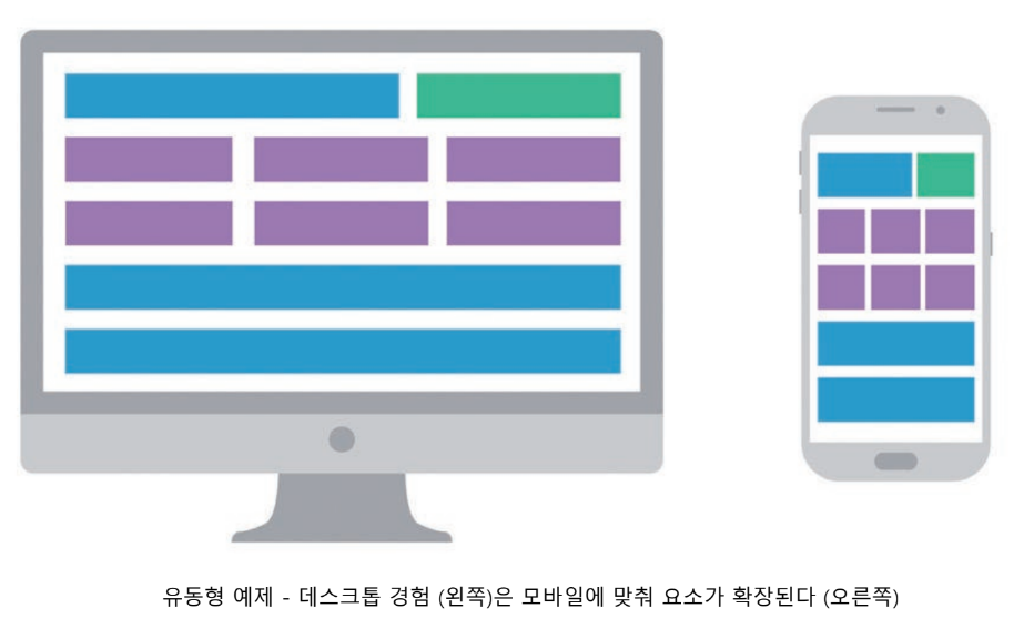 유동형 페이지는 요소의 크기를 퍼센트로 정의, 따라서 큰 스크린에서 점유했던 공간과 동일한 퍼센트의 공간을 작은 스크린에서 차지하게 된다.