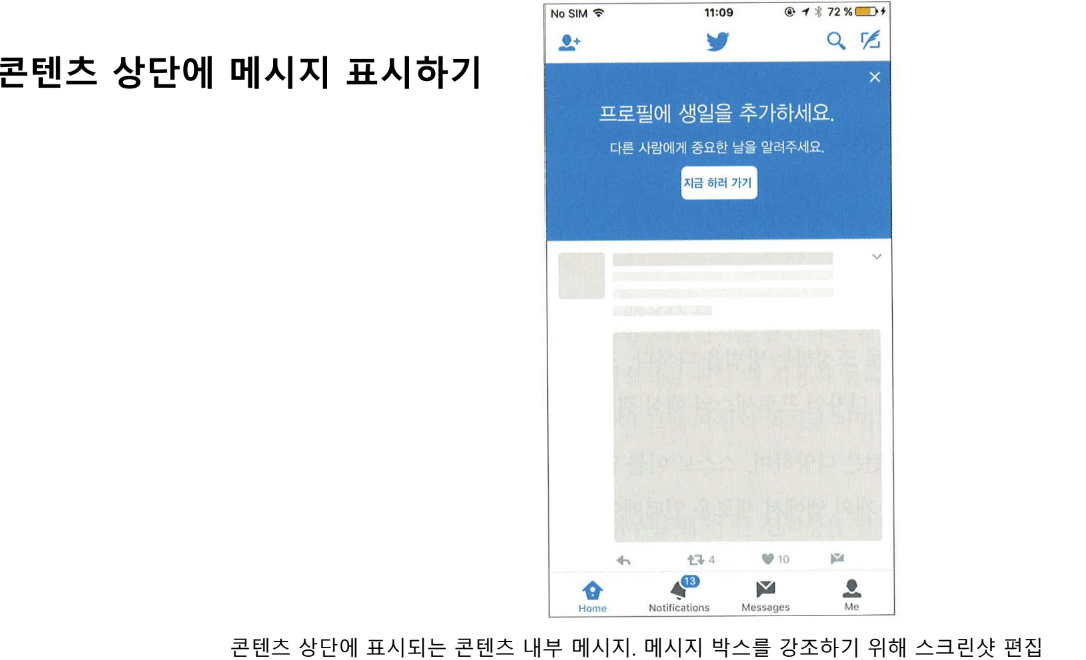 이 기법은 앱의 콘텐츠 섹션 사이에 메세지를 통합하는 방법으로 이루어지며, 지난번 버전에서 새롭게 추가한 신기능을 사용하기 위해 첫 단계를 돕거나 or 그들이 일반적으로 찾아본 적 없는 앱의 특정 영역을 소개해 줌 => 앱 맞춤화, 사용자 경험을 개선하기 위한 새로운 사용자 데이터를 수집하는 용도로 이 기법을 사용할 수도 있다.