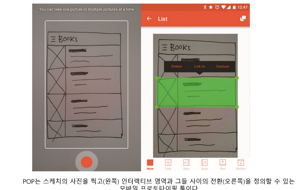 완성도 레벨 기준 : 종이 프로토타이핑은 완성도가 낮은 접근법 / 이는 인터페이스의 다양한 부분을 그린 종이조각을 자르고, 붙이고, 이동시키는 것으로 구성됨