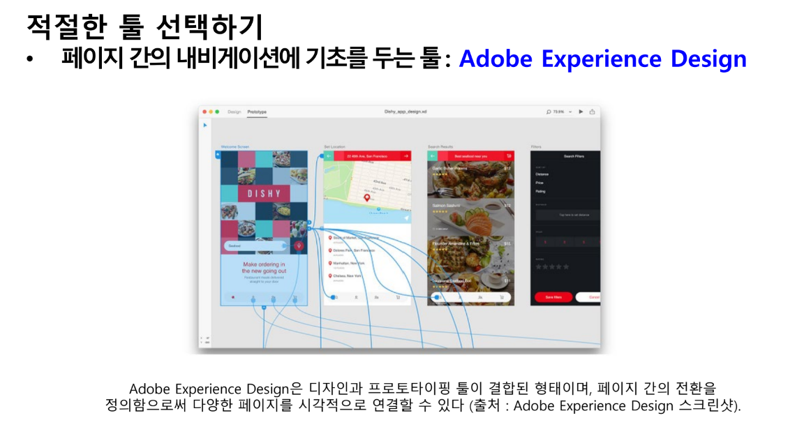 활용 가능한 다양한 프로토타이핑 툴이 있고 그 수는 더 늘어날 것 / 툴의 대부분은 유사한 접근법을 따르고 이로 인하여 한 가지 툴을 이해하면 다른 툴을 익히기가 어렵지 않음