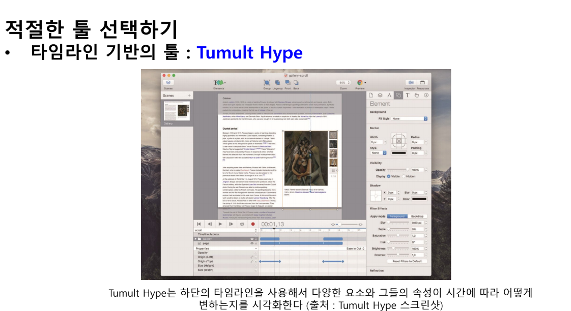 레이어를 기초로 하지만 시간에 중요한 역할을 부여, 타임라인을 통하여 프로토타입의 애니메이션과 전환에 대한 상세한 컨트롤을 제공