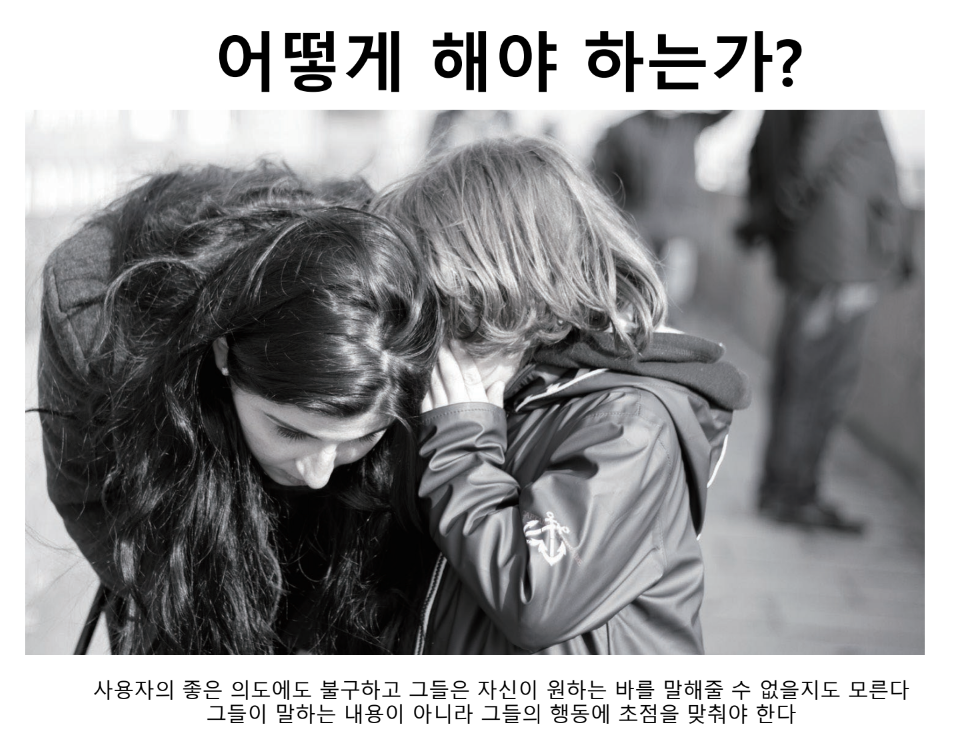 - 사용자는 제품의 최종 심사위원이지만, 그들의 행동을 사전에 예측하기란 매우 어려운 일, 무엇을 원하는지 그들에게 묻더라도 그들이 말하는 내용이 정말로 필요한 것인지는 확신할 수 없다.